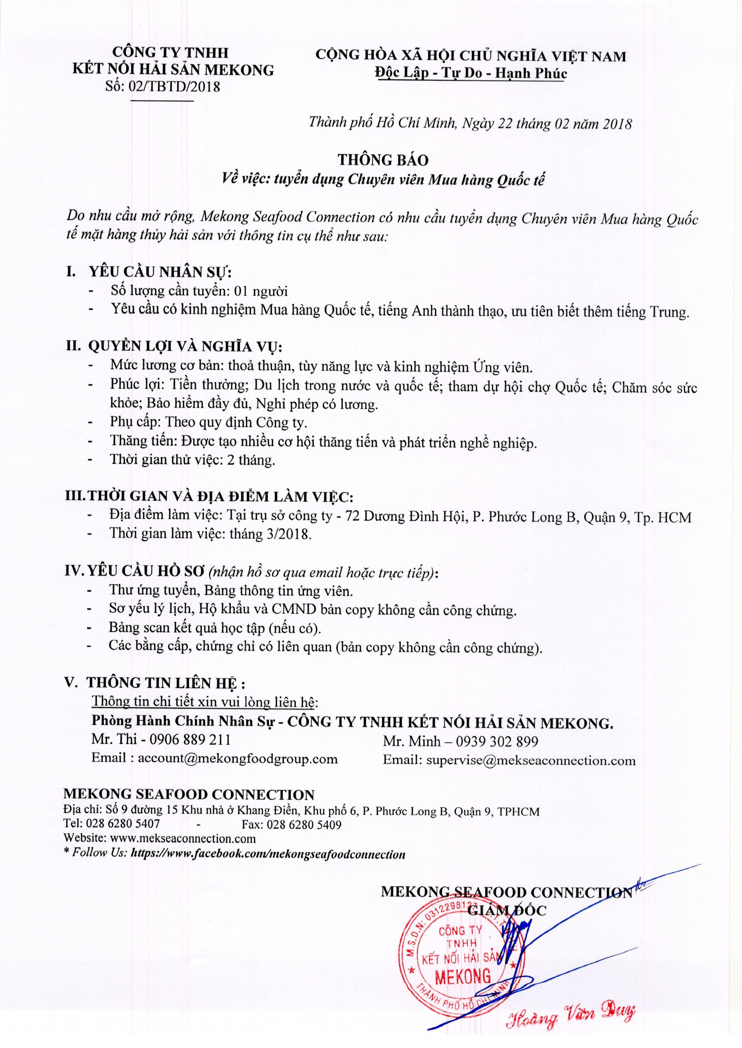 – International Purchaser: 01 person – Experienced in International Seafood Business, English proficiently (details as attached file: International Purchaser).